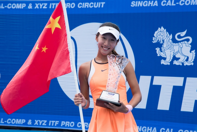 The 18-year-old from Beijing rallied back from behind in the third set and fought off a match point in the ninth game to beat the 301st ranked opponent 6-2 1-6 7-5 in a nail-biting final that consumed two hours and 29 minutes.