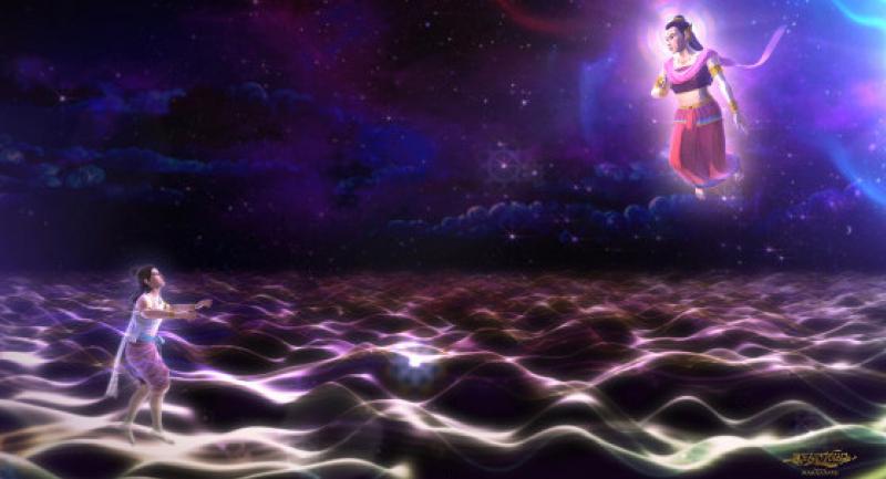 In the second act, the prince is already grown up and is travelling by boat to Suvarnabhumi when a massive storm blows up and wrecks his ship. He survives by swimming for seven days and seven nights and finally gets help from the angel Manee Mekhala, who takes him to Mithila.