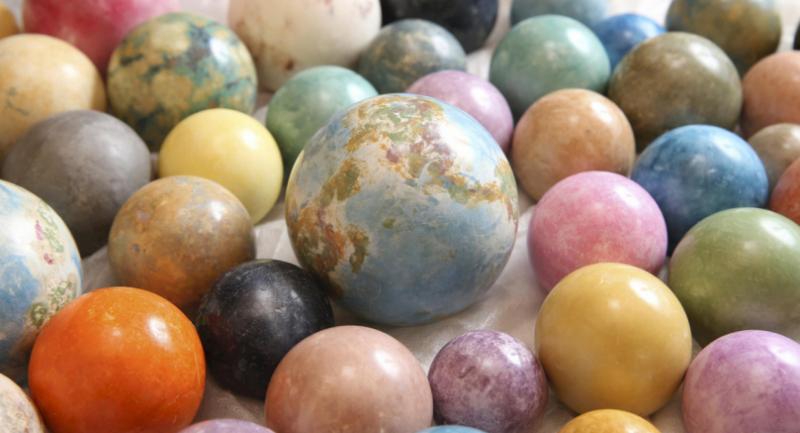 Dorodango made by Kiyoko Miki have the appearance of beautiful jewels. They come in various sizes, and some maintain their earthy texture while others are intricately painted.