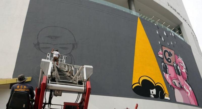 Just as the “graffiti” mural is being completed, members of various art institutes will be getting to work on another one on the wall joining the centre to the National Stadium BTS station. This one will be a huge portrait of His Majesty surrounded by scenes of grieving people.