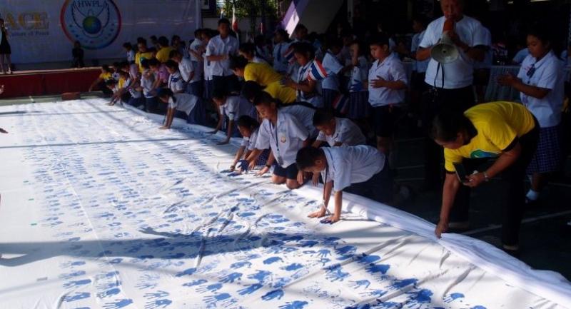More than 1,000 students at Asawittaya School in Samut Prakan’s Phra Pradaeng district enjoyed getting their hands dirty recently as they spread their inky fingers on a 10 by 15 metre piece of linen to form the shape of the Thai flag. The event, dubbed “Spreading a Culture of Peace”, was organised by Korea’s Heavenly Culture, World Peace, Restoration of Light (HWPL) and International Women’s Peace Group in Thailand. Its aim was to sow the seeds of peace in the minds of the students, who are the hope of this generation and the leaders of the future.