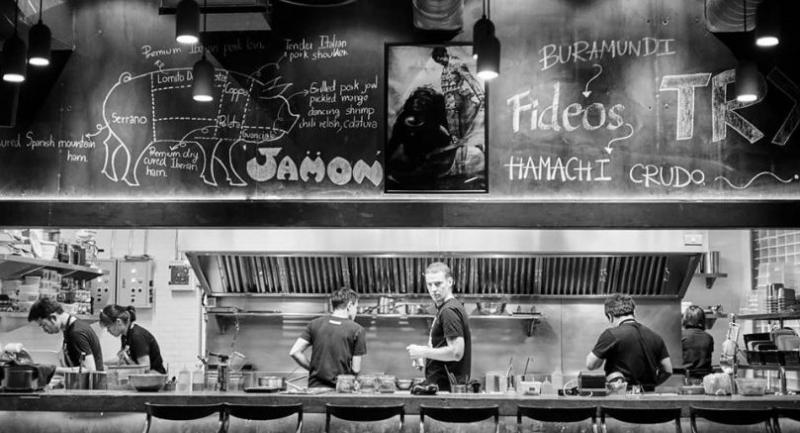 A second set of tapas is served warm and includes Patatas Bravas (roasted potatoes, pimento spiced tomato and aioli), Filete a La Plancha (spice rubbed hanger steak, caramelised red onions and green curry butter), Guanciale (grilled pork jowl, pickled mango, dancing shrimp, chilli relish and colatura) and Paella de Mar y Tierra with clams, shrimp, chorizo and bomba rice.