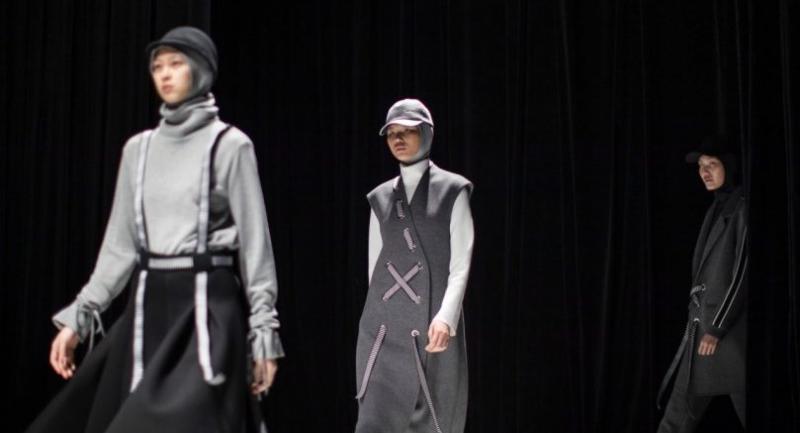 Eschewing the hijab, her female models cover their hair with a baseball-like cap worn over a tight hood and stylish big turtle-neck collar.