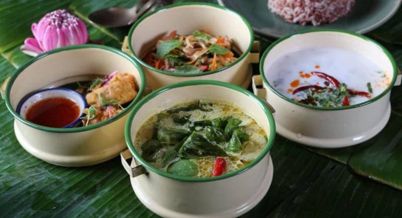 For Isaan spiciness there’s the “Sab Lai Pinto Set”, with grilled chicken in spicy-and-sour chilli sauce, papaya salad, fried pork or chicken with herbed meatballs, spicy-and-sour snapper soup with herbs, and steamed sticky rice.