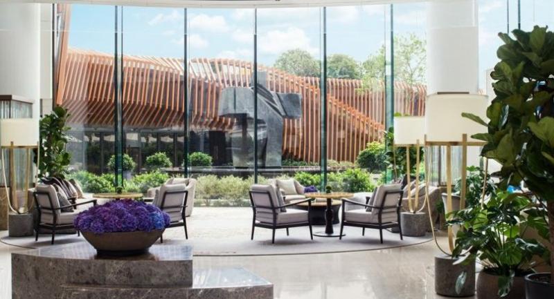 Upon arrival in the lobby, guests will be welcomed by remarkable views of the waterfront through a curved glass window that soars eight metres high and spans a width of 80 metres. The lobby opens onto a vast outdoor garden with topiary hedges. Adding to the stylish decor is a 50-metre Turkish onyx marble wall leading to the Grand Staircase and Grand Ballroom.