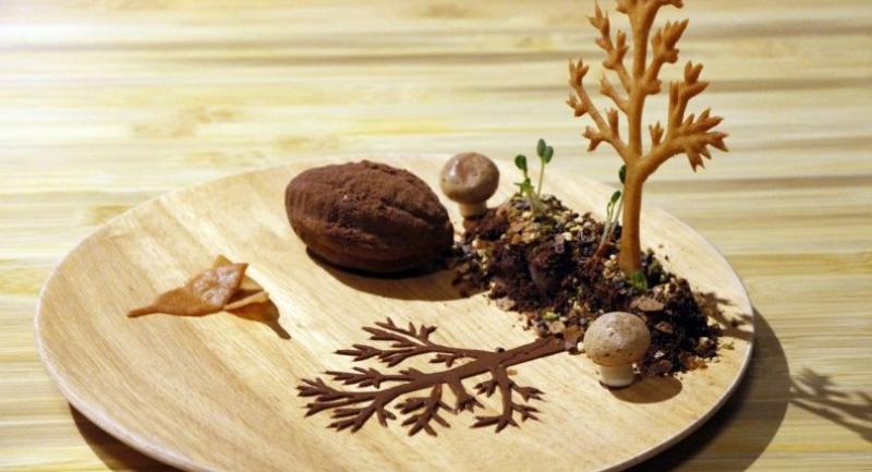 Dej’s study of the origins of chocolate is translated into Cacao Story. The cacao tree is modelled from cookies mixed with miso and its shadow is made from chocolate sauce. The soil is formed from chocolate cake and praline awhile in the shade is meringue that looks just like mushroom. Just like the real thing, the cacao pod is created from chocolate cake mixed with hazelnut praline.