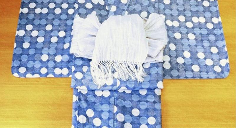 Another yukata recommended by Ito has large, blue dahlia flower patterns on a white background, also a design from the meisen fabric.