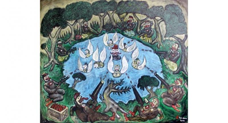 For almost 40 years, Heri Dono has developed a fantastical world of dichotomies in his paintings. Humorously juxtaposing reality with imagination, folk with contemporary art, and politics with fiction, the tension between these opposing forces create narratives that cut across a complex, multilayered system of ideologies. Having lived through the struggle against oppression by the Indonesian regime in the 1980s, and later the “reformasi” in 1998 that spawned from the end of Suharto’s regime, Heri Dono’s artistic methodology reexamines power structures through satirical illustrations of humans versus the Other, man versus machine, offering a kind of passage for others to survive real life transitions during challenging times.