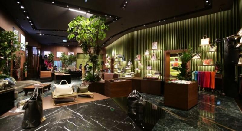 The physical space plays with a harmonious contrast between the atmosphere of a garden and the alcoves distributed all around the shop to accommodate the ready-to-wear and home furnishings.