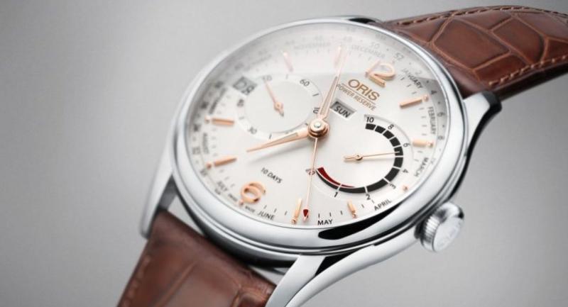 It will have apertures at 12 and 9 o’clock for the day and date indications, while the same central pointer hand will show the week and month. The hand has a red tip that corresponds to a gauge around the outside of the dial. Oris has engineered Calibre 113 so that all of these functions, as well as time setting and winding, can be operated through a single crown.
