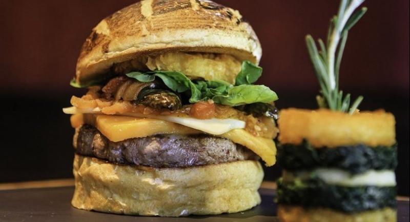The best-selling Dry-Aged Beef Burger includes a 200-gram beef patty made using 28-day aged USA striploin in a homemade rye bread bun with Canadian bacon, Cheddar cheese, green pepper mayo and is served with a side of potato wedges.