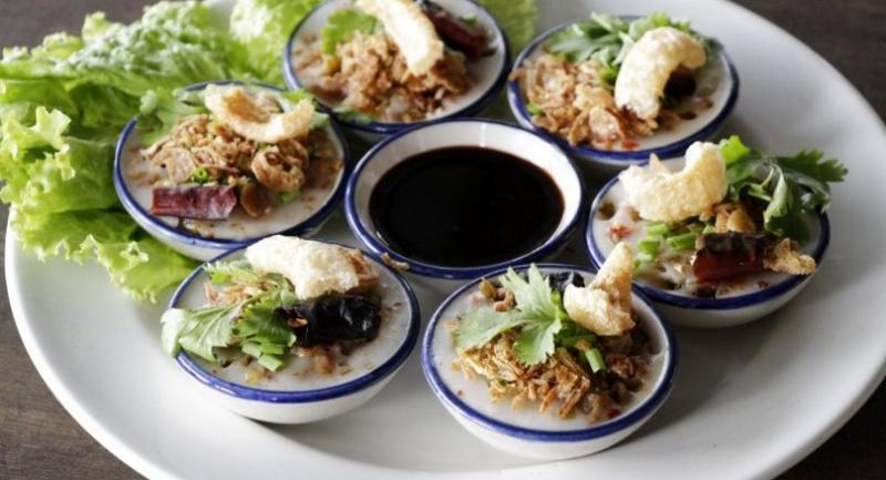 Inspired by kanom tuay (steamed coconut milk pudding in a small-sized cup), the stir-fried minced pork with pickled cabbage is layered in a cup with coconut cream mixed with rice flour and arrowroot and steamed for 10 minutes. It’s then topped with fried shallot, chopped spring onion and coriander leaves, dried chilli and crispy pork crackling. Her creation sells for Bt70 for six cups.