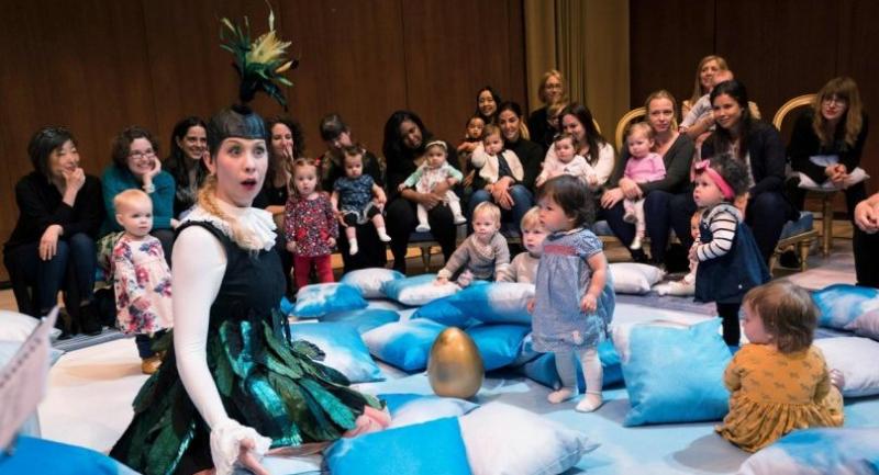 Then the music started. Sung in Italian and baby sounds, the opera is performed by a cellist, a percussionist and two singers, who roam among the children, introducing them to furry toy birds and a golden egg.