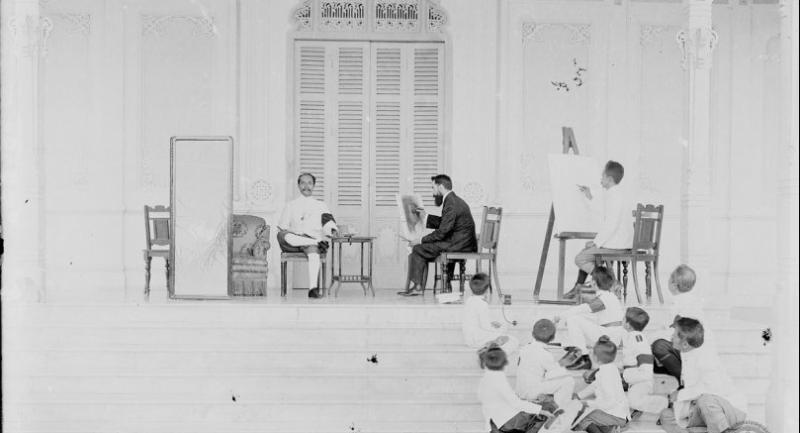 This 1906 picture depicts Italian artist Cesare Ferro painting the portrait of King Chulalongkorn in front of the Aphisekdusit Throne Hall while Thai court painter Phra Soralaklikhit records the pair at work.