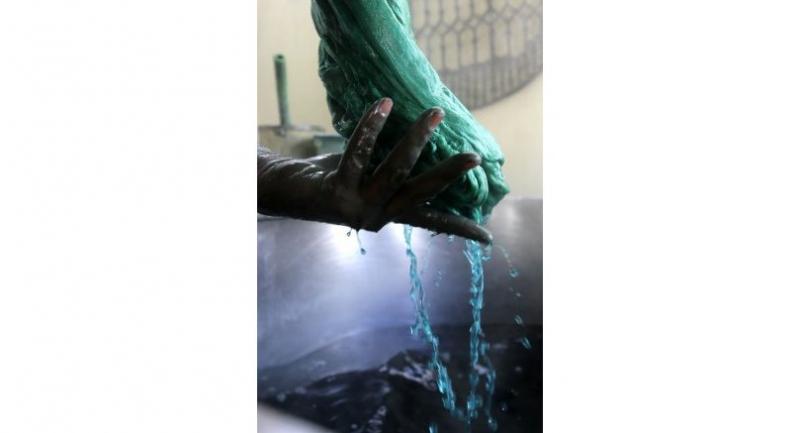 Rihawi throws a thimbleful of turquoise and a dash of orange into a pot, and dilutes the colour in a large metal saucepan. Using his hands, he bathes the threads in it.