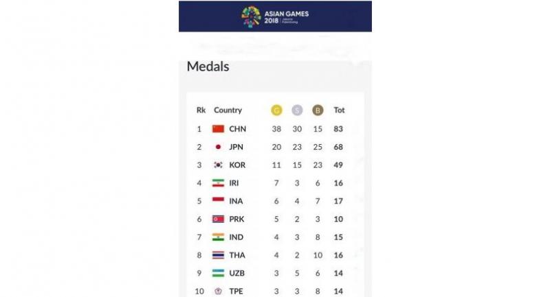 Medal Tally after day five of the 2018 Asian Games.