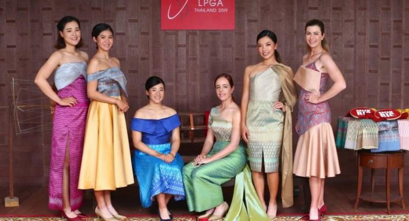 Six featuire stars – In Gee Chun of South Korea, Pannarat, Suzuka Yamaguchi of Japan, Georgia Hall of England, pin-up girl Munie He of China and Paula Creamer of the US – dressed in Thai traditional silk costumes for a photocall yesterday. They also learned embroidery handwork, which was part of the promotional activities in the build-up to the tournament.