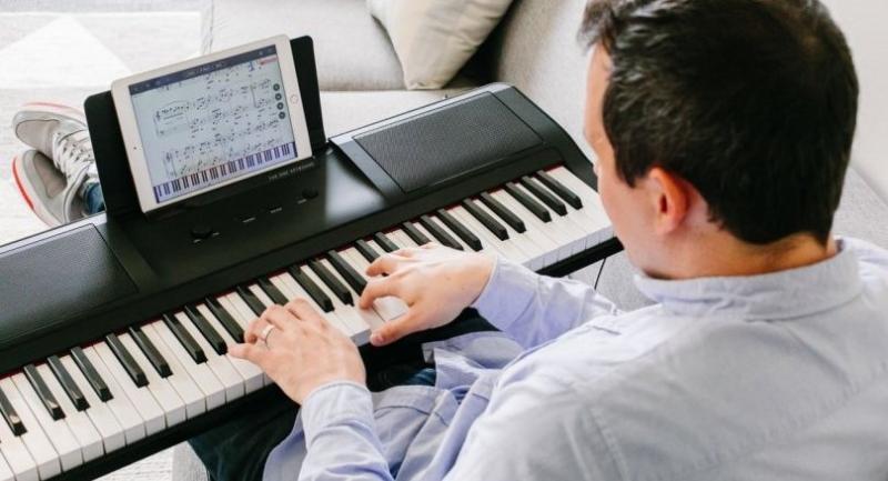 The keyboard is 36 inches long, 13 wide and four deep, and weighs 5.44 kilograms. It comes with a music stand on which you can park your sheet music, an iPad or a smartphone – whatever holds the notes you’re following.
