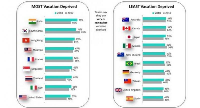 The study examines vacation usage and trends across 19 countries. The report also found that global vacation deprivation is on the rise, and that workers in Thailand took the fewest number of vacation days in the world in 2018, alongside Japan and the US.