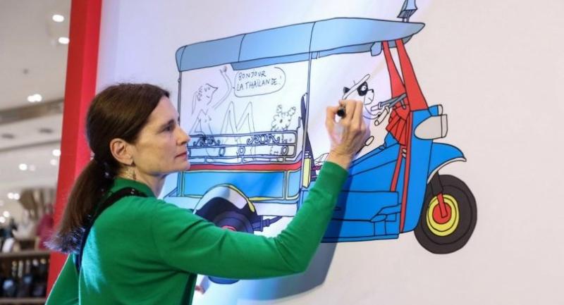 Bravi treated guests at the event to a demonstration of her talent, drawing her trademark Parisian girl with long legs descending into chic high heels – but this time riding in a tuk-tuk.