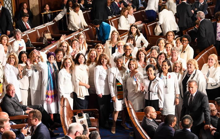 The women of the House Democratic caucus had pulled out their white suits for the speech. It's never good for Trump when they pull out the suffrage white and move en masse like some righteous regiment of lady warriors. The clothing choice was ostensibly to mark the 100th anniversary of the passage of the 19th Amendment, which gave white women the right to vote. But the color was also emblematic of a white hot fury that is roiling the Democratic Party.