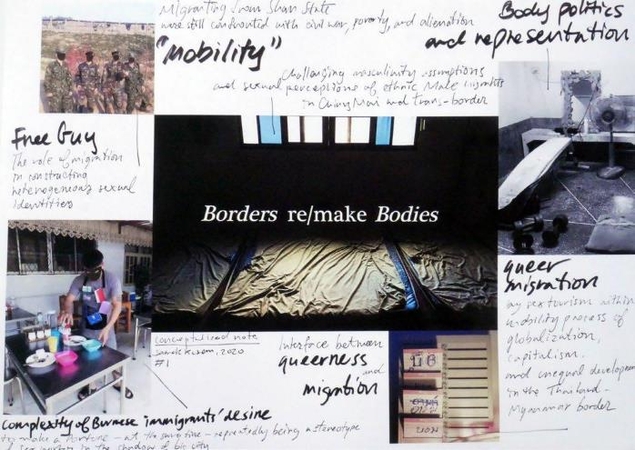 Complementing the exhibition through the intersection between art and anthropology is the installation, "Borders re/make Bodies: Chiang Mai Ethnography" (2017–ongoing), by Thai Samak Kosem. Extending from his current doctoral research, Samak’s ethnographic materials focus on assumptions about masculinity and gender perceptions of male migrants and transborder individuals through the critical framework of body politics. Spanning from video to field notes, photography and text, "Borders re/make Bodies" considers the interface between queerness and migration specifically to the northern city of Chiang Mai, located a few hundred kilometres from the border with Myanmar. As part of his ongoing anthropological research, Samak has interviewed and interacted with migrant communities of diverse Burmese ethnic minorities, predominantly Shan, to understand their place in mainstream society both as illegal migrants and as sex workers.