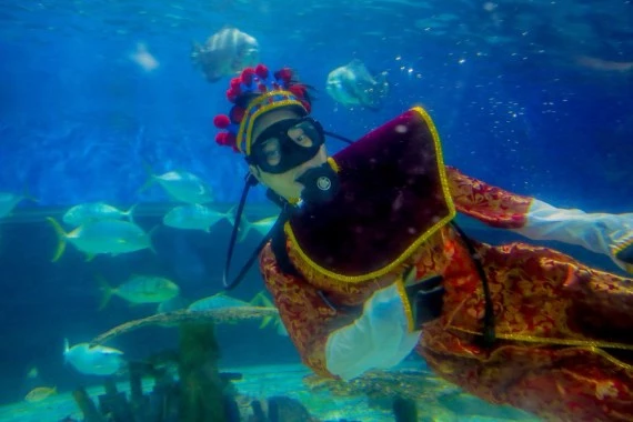 A diver is dressed as the "God of Wealth" at Manila Ocean Park to celebrate the Chinese New Year.