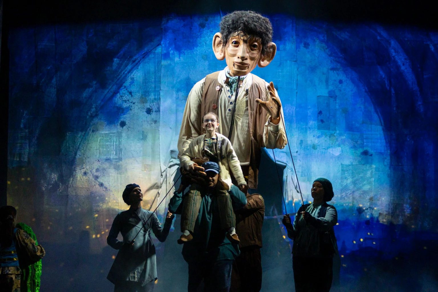 To conjure a magical dream world that travels from an orphanage to Giant Country and on to Buckingham Palace, populated by characters of vastly different sizes, director Daniel Evans and puppet designer Toby Olié deploy four distinct scales of puppetry across various scenes. In Giant Country, for instance, the kidnapped orphan Sophie appears as a half‑human‑sized puppet when she shares the stage with the BFG—an ogre smaller than his peers, bullied by them and notably the only one who does not eat humans—portrayed by a live actor. The BFG speaks in his natural voice, while Sophie’s lines are delivered through a speaker embedded within the puppet itself. When the human‑sized BFG finds himself opposite the Bloodbottler, the latter is rendered so enormous that only his head, upper body and arms are visible, manipulated by three puppeteers. It is an ingenious theatrical solution, though at the Wednesday preview the sound balance was occasionally uneven. That said, the ensemble of actors and puppeteers deserves full credit for switching fluently between roles and techniques with energy and precision.