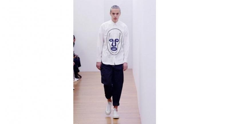 The shirts are embroidered with graphic faces designed by French illustrator Alexis Beauclair, which also appear as patterns on intarsia sweaters. An abstract camouflage-style designed by American painter, Candida Alvarez is also used all over, or spliced with sleeves in a tablecloth-style floral pattern.