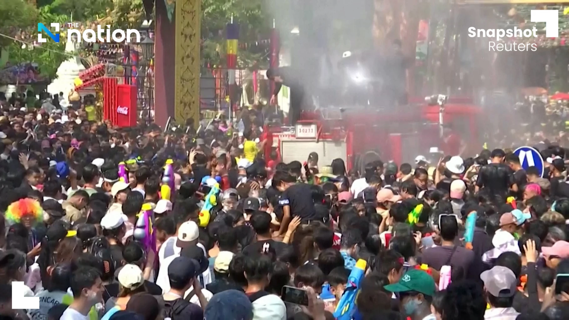 Large crowds of mostly young men and women, some armed with water guns, gathered at the stage in front of Wat Phnom Historical Resort, bouncing to the beats of the music while firemen sprayed water from the top of the fire trucks to cool them down.