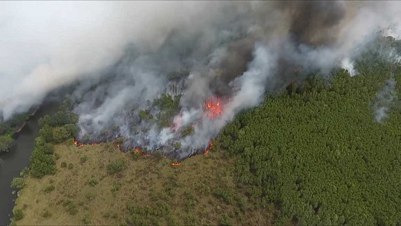 The wildfires engulfing Khuan Khreng peat forest in Nakhon Si Thammarat province reignited on Sunday (August 4) and were spreading fast on Monday, damaging forestland between Chian Yai and Cha-uat districts.