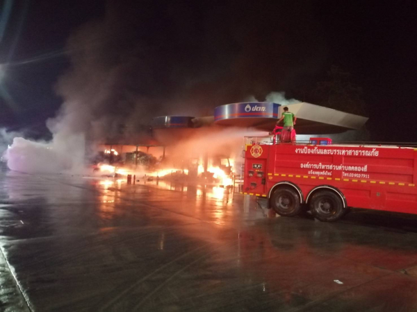 The Klong Luang police station was alerted to the fire at the Sri Somboon Pattana NGV station on the frontage road along motorway No 9 in Tambon Klong Si at 2.30am. t