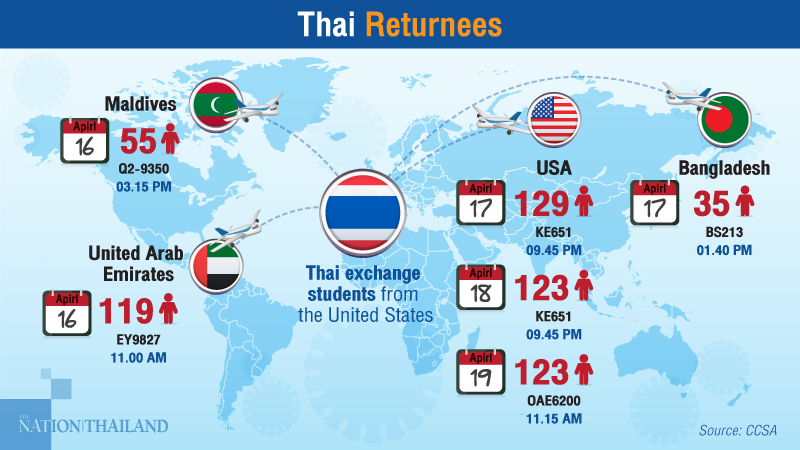 On Friday (April 17), 129 Thai exchange students from the United States will arrive aboard flight KE651 at 9.45pm, while 35 Thai workers on flight BS213 from Bangladesh will land at 1.40pm the same day.
