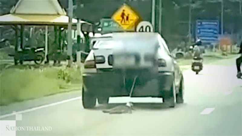 The clip shows the apparently lifeless dog being dragged by a rope attached to a car in Kantharalak district, Si Sa Ket province.