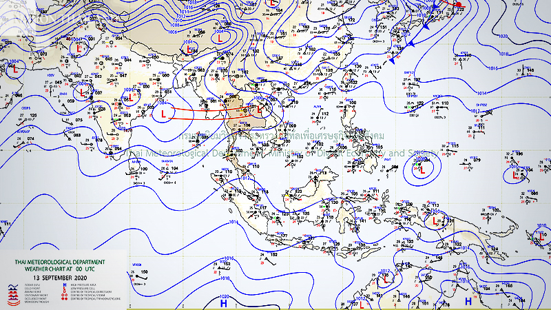 During September 12-15, the monsoon trough moves down to lie across the North, the upper Central and the Northeast. The southwest monsoon still prevails over the Andaman Sea and Thailand. Rains continue over many parts of Thailand with isolated heavy rains. Strong winds and waves are forecast in the Andaman Sea and the Gulf of Thailand, rising 1-2 metres in the Andaman Sea and above three metres in thundershower areas. On September 16-17, the monsoon trough lies across the upper North and Laos, bringing less rain to upper Thailand. The southwest monsoon prevailing over the Andaman Sea and the South will strengthen, bringing isolated heavy rain to the South and the East. Moderate winds and waves are likely in the Andaman Sea and in the Gulf of Thailand, about two metres high in the Andaman Sea and above three metres in thundershower areas, 1-2 metres in the Gulf of Thailand and above two metres in thundershower areas.