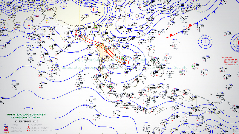 From September 27 to October 2, the monsoon trough will shift to lie across the lower North, the Central and the Northeast, while the low cell over the South China Sea will follow the monsoon trough to the East, the lower Central and the upper Gulf. The southwest monsoon prevailing over the Andaman Sea, Thailand and the Gulf will strengthen. More rain is expected over Thailand with isolated heavy to very heavy rain. Winds and waves in the Andaman Sea and the Gulf of Thailand will strengthen -- about two metres high in the Andaman Sea, 1-2 metres high in the Gulf of Thailand and above two metres in thundershower areas.