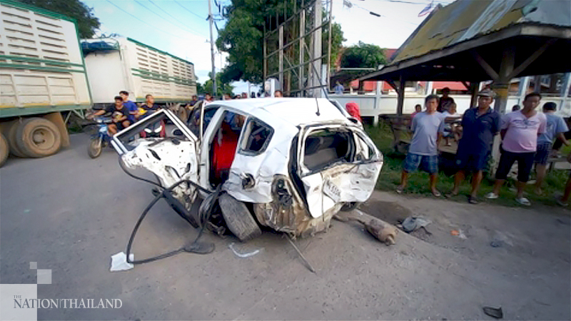 Khok Samrong police found a severely damaged white Honda Jazz car, which had been hit in the back by a Toyota Revo pickup truck that was carrying water bottles. Witnesses said the impact sent the Honda Jazz into the opposite lane where it crashed into a Toyota Commuter van in the front. Both the pickup truck and the van suffered moderate damage at the front.