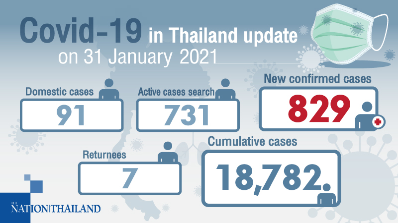 The Centre for Covid-19 Situation Administration (CCSA) on Sunday reported 829 new cases, including seven overseas travellers in quarantine.