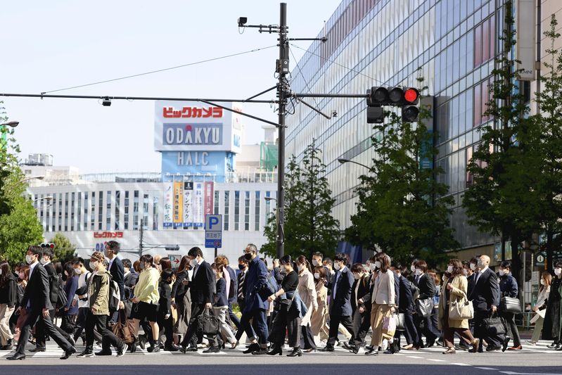 At Shinjuku Station, company employees and others wearing masks hurried to work, passing through ticket gates from 7 a.m. to 9 a.m. on Monday. In front of the station, sidewalks were crowded with commuters waiting for traffic lights.