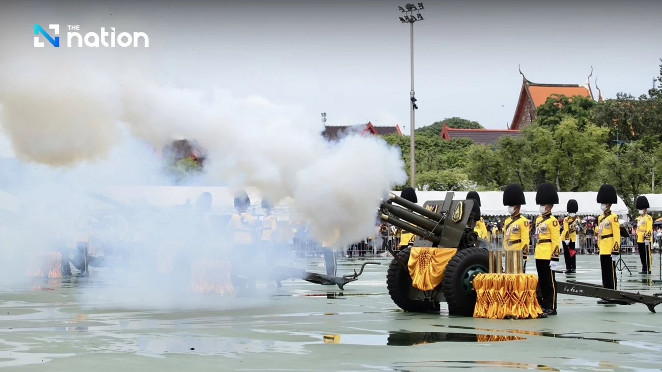 The army used four 75mm artillery units to fire a 21-gun salute at Sanam Luang with five-second intervals. It took one minute and four seconds to finish the firing of artillery rounds.