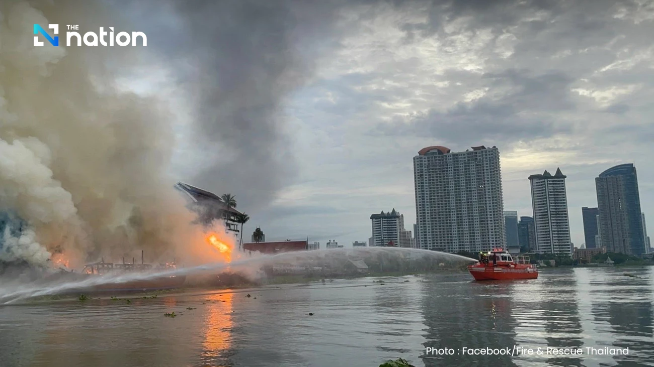 A tourist boat caught fire this morning near the Anantara Riverside Hotel on Charoen Nakhon Road, Thonburi District, Bangkok, prompting a swift response from firefighters who are still working to put out the blaze.