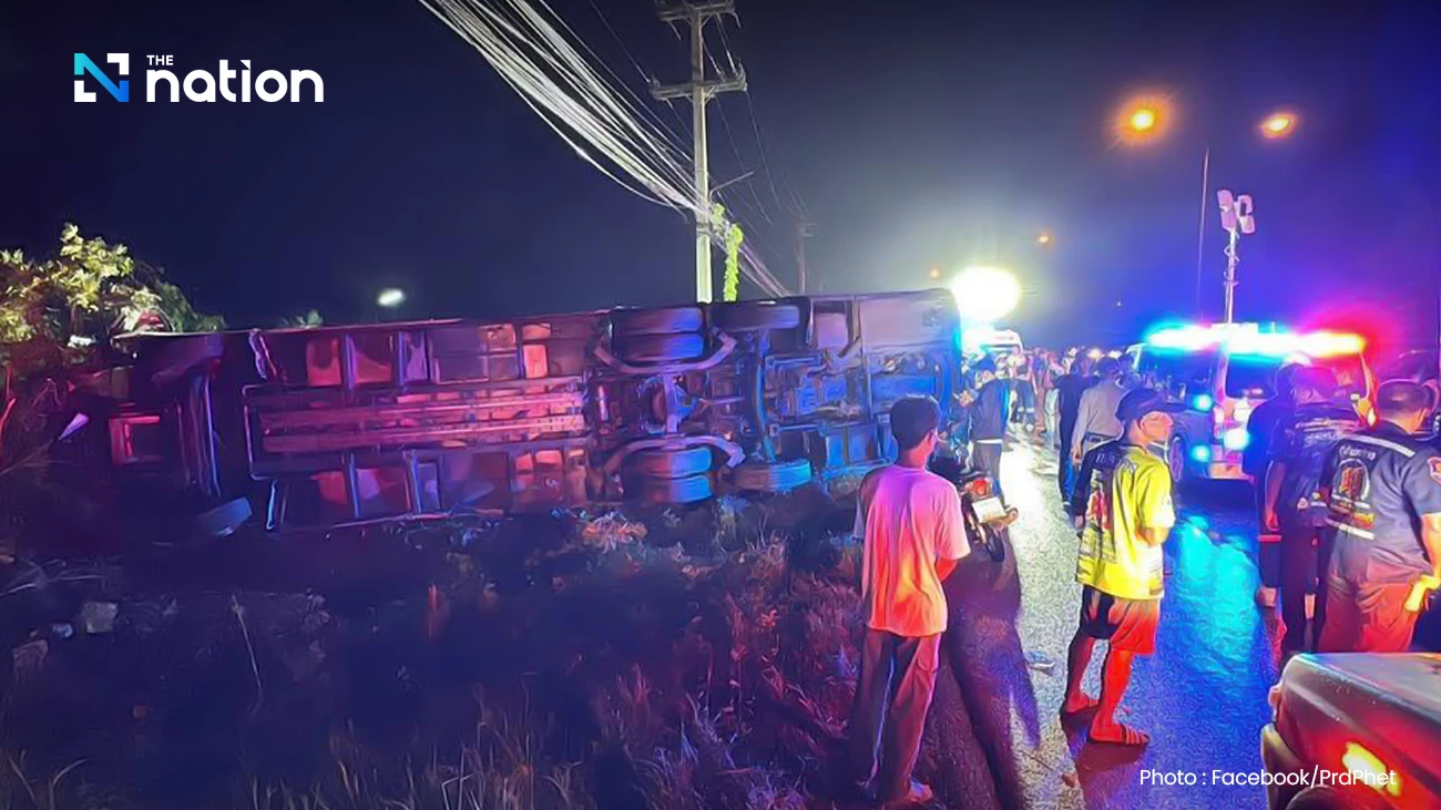 On the evening of Tuesday at approximately 8:00 p.m., a tour bus lost control and skidded off the road near a sharp curve on the Phetkasem Road (southbound) at kilometre 151-560, in the Huasaphan area, Phetchaburi Province. Fortunately, all 28 passengers and 2 crew members managed to exit the vehicle safely. Nine people sustained minor injuries.