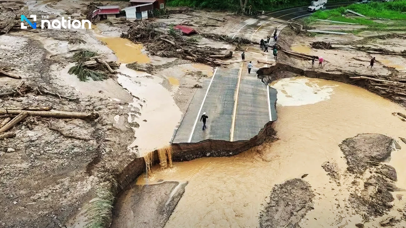 After the northern province experienced heavy rains triggered by a low-pressure system, a remnant of Storm Kajiki, subsequent run-offs washed away a section of Highway No. 108 in Ban Huay Pong village.
