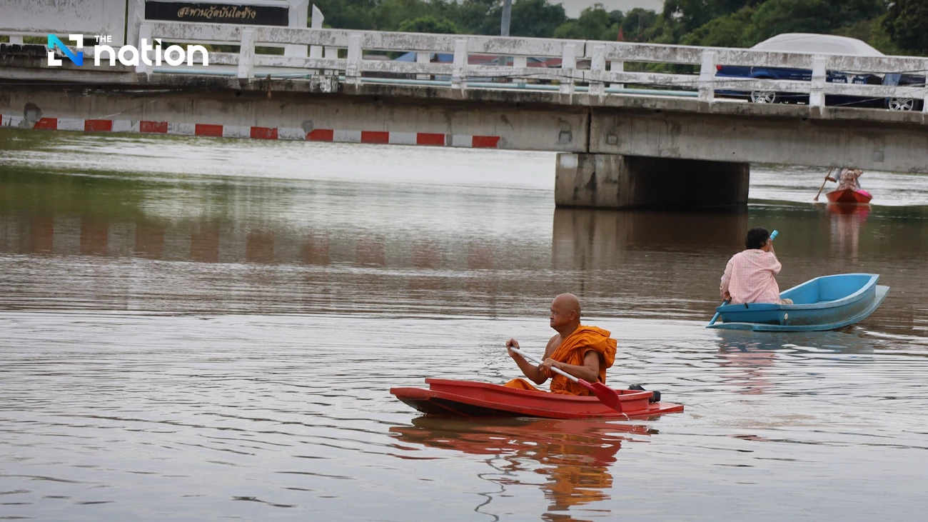 Homes along the Noi River are heavily submerged, with many residents relying on boats for transport. At Hua Siang Bridge, water levels have nearly reached the bridge deck.