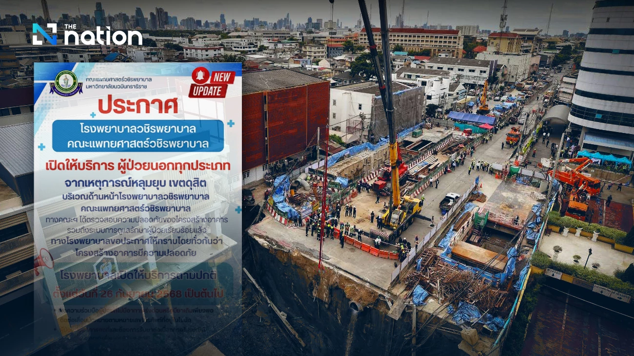 Following the sinkhole incident on Samsen Road, Dusit District, in front of Vajira Hospital on Wednesday (September 24), the Hospital has thoroughly inspected the building's structural safety and patient care systems. The hospital confirms that the building's structure is safe and secure.