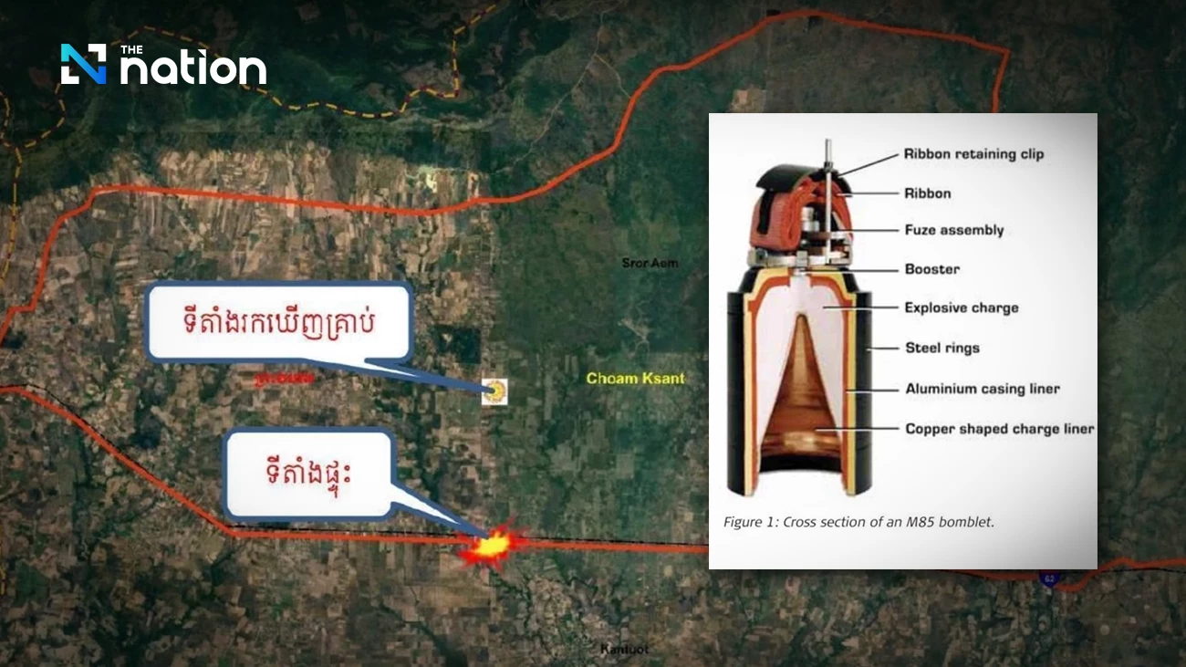According to Cambodian reports citing a statement by the Cambodian Mine Action Centre (CMAC) on October 25, 2025, forensic analysis and photographs from the site allegedly identified the explosive as an M85 cluster submunition from an M396 155mm artillery shell “fired by the Royal Thai Army.” The statement further claimed the munition was an unexploded remnant from clashes along the border between July 24 and 28, 2025.