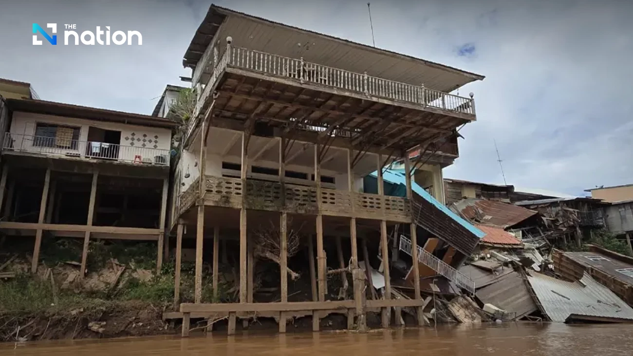 A severe riverbank collapse along the Nan River in Moo 1, Rim Nan community, Tha Sak subdistrict, Phichai district, Uttaradit, has caused extensive damage to at least six homes, with one three-storey shophouse crashing into the river. No injuries or fatalities have been reported.