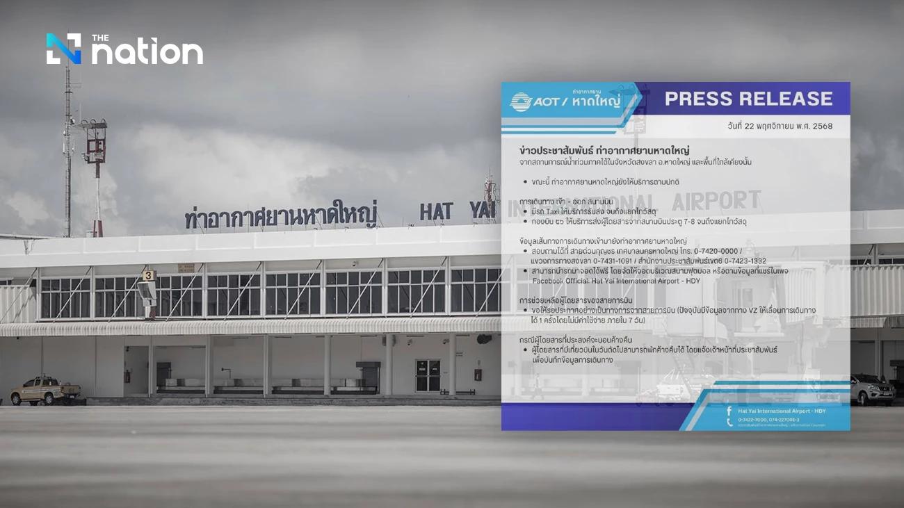Airports of Thailand (AOT) has confirmed that Hat Yai International Airport remains fully operational despite severe flash flooding across Hat Yai and other parts of Songkhla province. Meanwhile, the State Railway of Thailand (SRT) and the State transport company (BKS) have suspended multiple services due to impassable routes.