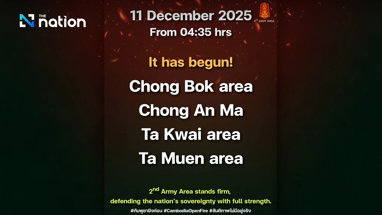 The 2nd Army Area has reported that fighting along the Thai-Cambodian border reignited at 4.35am on Thursday (December 11, 2025), with military activity detected at several key locations — Chong Bok, Chong An Ma, Ta Kwai and Ta Muean — all strategic routes along the frontier in Surin and Buri Ram provinces.