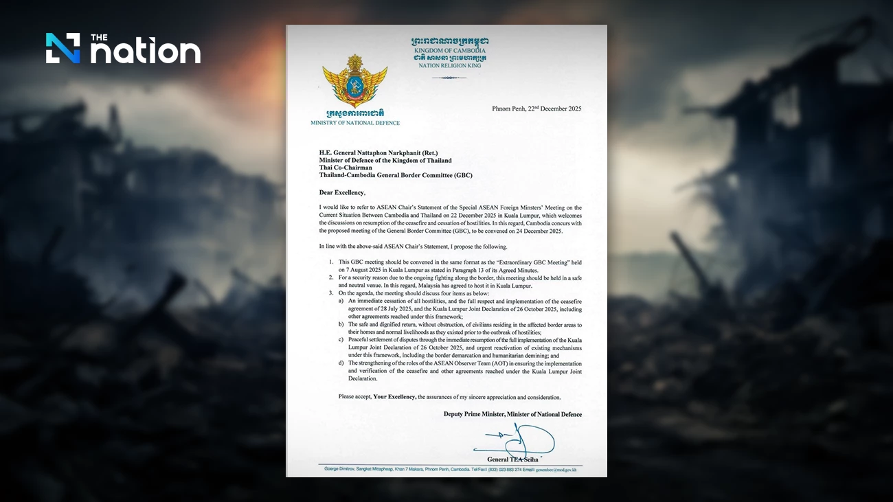 According to the update, Cambodia’s Defence Ministry—signed by Gen Tea Seiha, Cambodia’s defence minister—sent a formal letter to Thailand’s defence minister dated December 22, 2025, expressing Cambodia’s wish to enter ceasefire negotiations. The move was described as an important step within the framework of conditions set by Thailand.